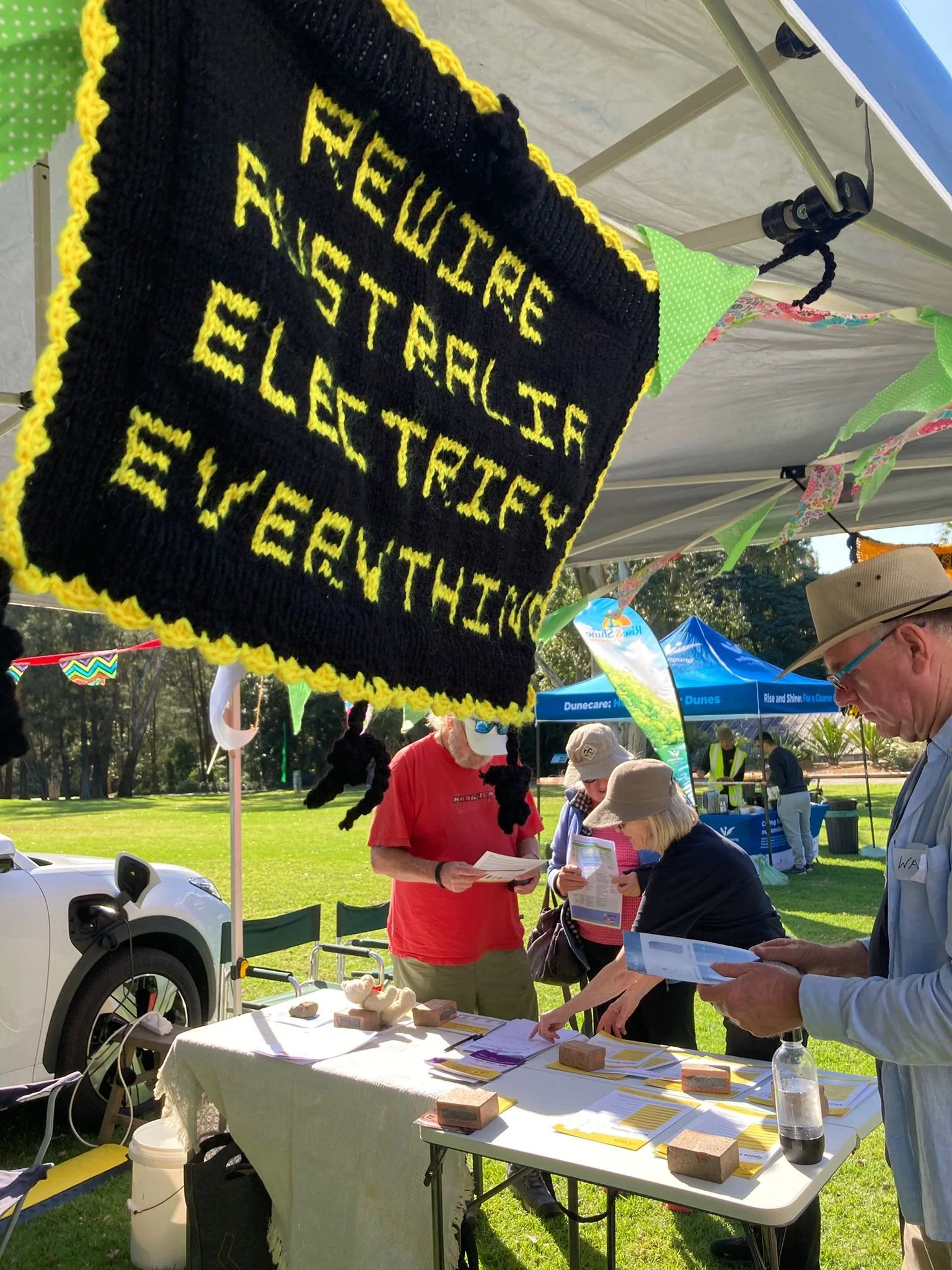 Fact sheets from Rewiring Australia with Knitting Nanna Cherry’s hand-knitted message fluttering above.